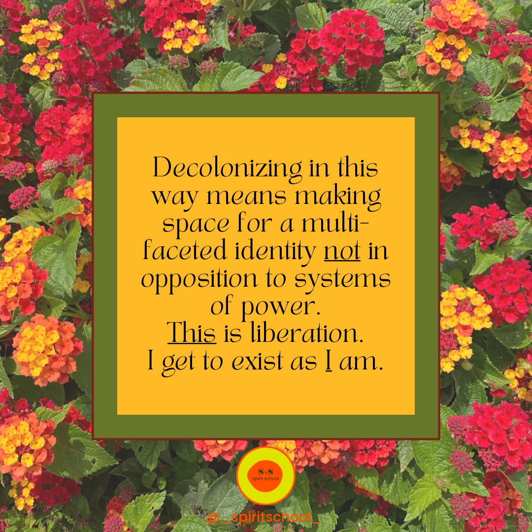 I’ve reoriented towards recognizing that I have been imprinted on in many ways that have allowed me to see the world from a uniquely beautiful and particular lens and story, while also recognizing that this imprinting has continual room to be shed and transformed. What has been done in me doesn't actually have to remain as part of my story if it does not serve my Becoming toward a fullness of Self and Relations. The work for me now is extricating the remaining slivers of colonialism that made their way into my mindbodyspirit through formation in this compromised world. Decolonizing in this way means making space for a multi-faceted identity not in opposition to systems of power. This is liberation. I get to exist as I am.